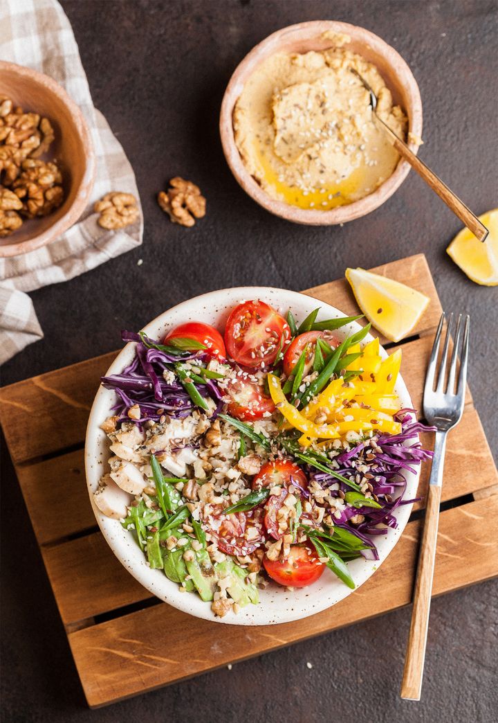 Organic corn, pepper, onions, orange filets and vinaigrette